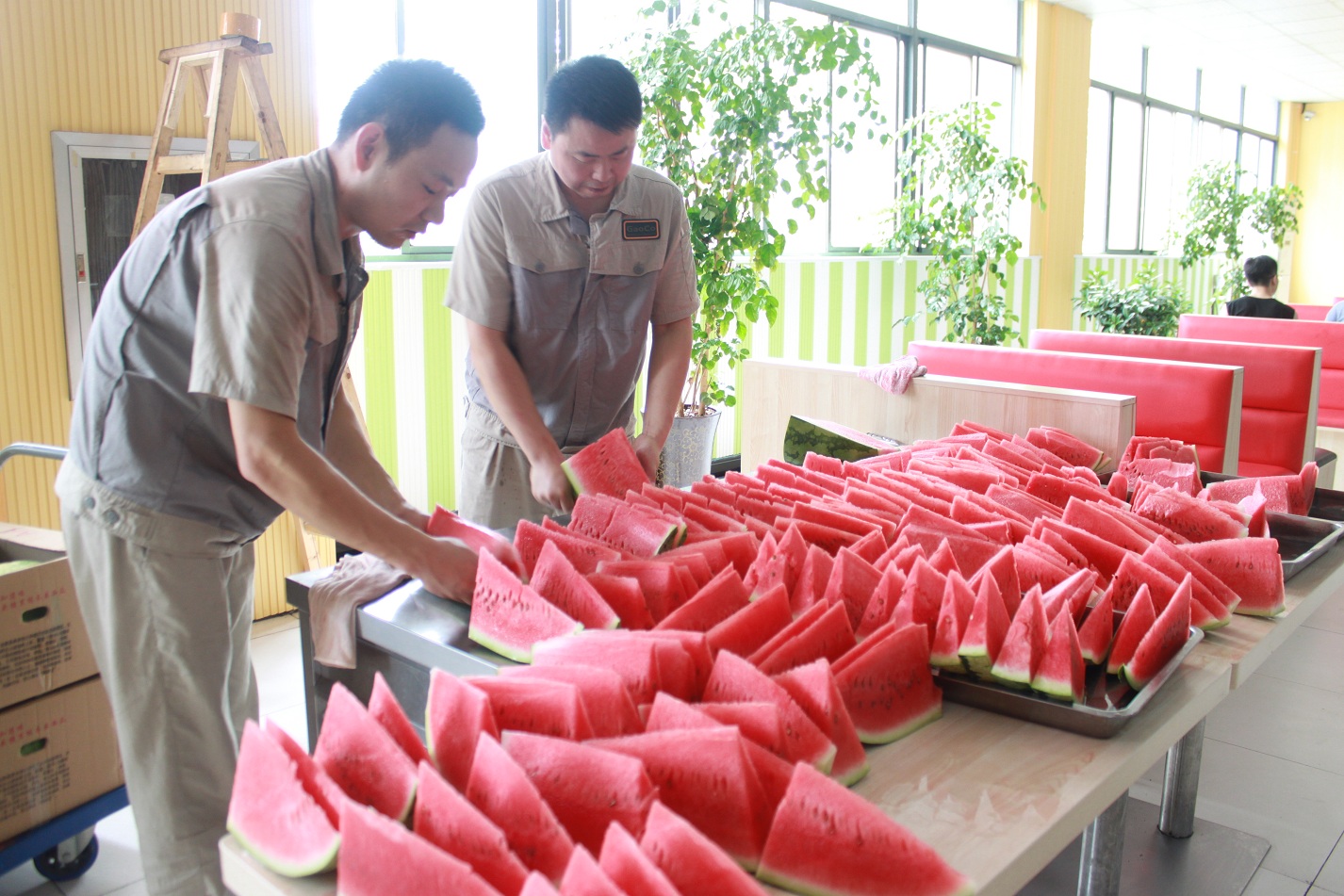 临时中餐开餐时间,工作人员已将西瓜切好,西瓜流出红色的果汁,让人不由得咽下口水!片片西瓜守在自己的“岗位”上,等候着为我们辛苦的员工们解暑释放!