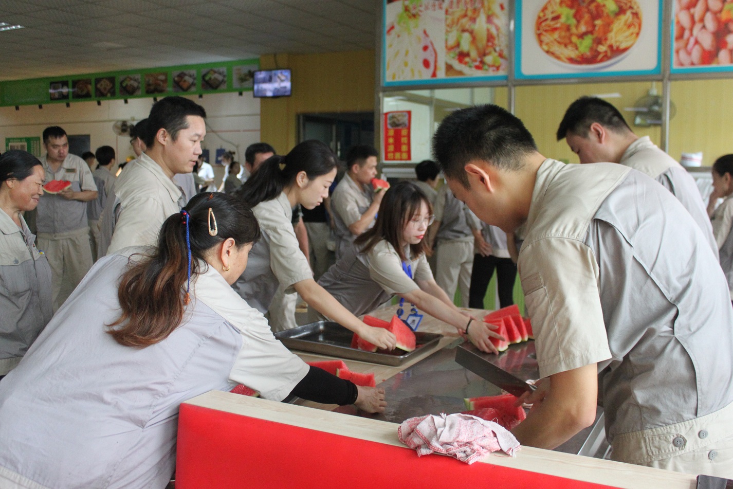 开餐时间到了,员工陆续来到餐厅,带着一身暑气,拿起西瓜咬了一口,从他们豆大汗珠的脸上,能感受到那份幸福与清凉。