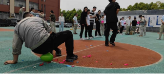 第二项进行的是“合力吹气球”,共有六组参加,每组4人,每个人分工不同,吹、扎、运、破,完整的运送5个气球并用屁股坐破所用的时间最短为获胜。这个项目不仅考验体力活、手工活,还考验足够强大的肺活量。