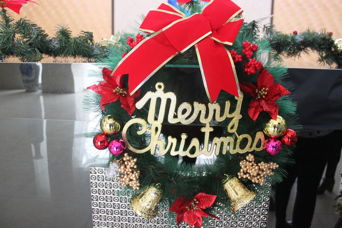 活动现场设在行政大厅,经过大家的努力,把大厅布置的非常漂亮,但前期的工作还是相当大的,写贺卡、组装圣诞树等,还搭配许多装饰。